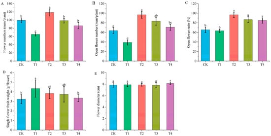 Plant yield after harvest. (A): Flower numbers; (B): open flower numbers; (C): open flower ratio; (D) single flower fresh weight; (E): flower diameter. Different letters in the same column indicate significant differences at 5% level.