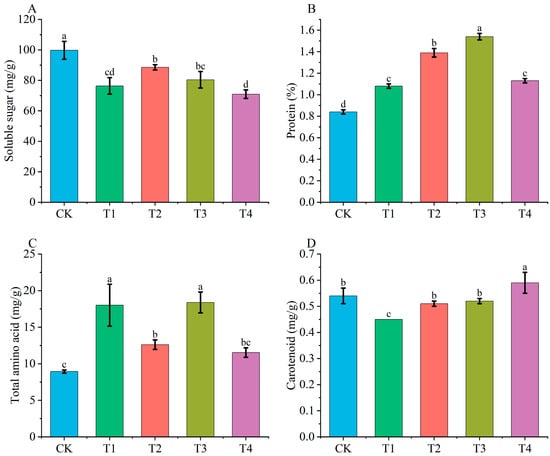 The carotenoid content in T1, T2 and T3 was 3.70–16.67% lower than the control. The carotene content of T4 was the highest, which was 9.26% higher than the control and 11.86–25.43% higher than T1, T2 and T3 (Figure 9D).