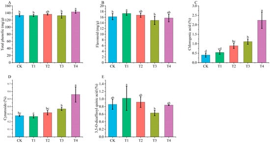 Changes in the health quality of plant inflorescences. (A): Total phenols; (B): flavonoid; (C): chlorogenic acid; (D): chlorogenic acid; (E): 3,5-O-dicaffeoyl quinic acid. Different letters in the same column indicate significant differences at 5% level.