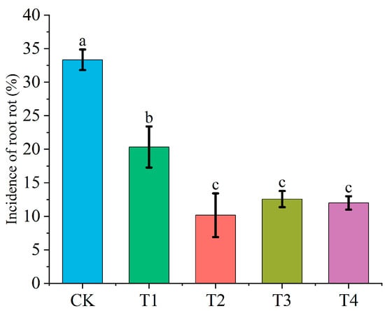 Compared with CK, the application of Chinese herbal compound fertilizer reduced the incidence of root rot and alleviated the occurrence of the disease. T2, T3 and T4 reduced root rot by 65–70% relative to the control (Figure 11).