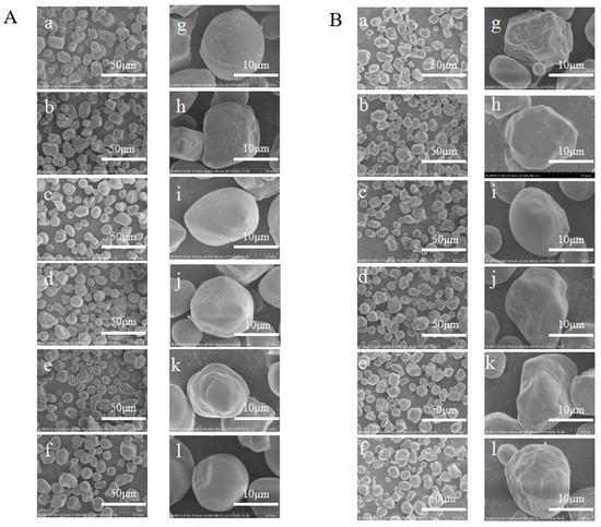 The effects of organic manure and nitrogen fertilizer application on the morphology of waxy maize starch, illustrated using scanning electron micrographs. Micrographs were taken at 1000 and 5000 magnification. (A,B) represent JKN768 and SYN2, respectively. (a–f) represent the results for T1, T2, T3, T4, T5, and T6 at 1000 magnification, respectively. (g–l) represent the results for T1, T2, T3, T4, T5, and T6 at 5000 magnification, respectively.