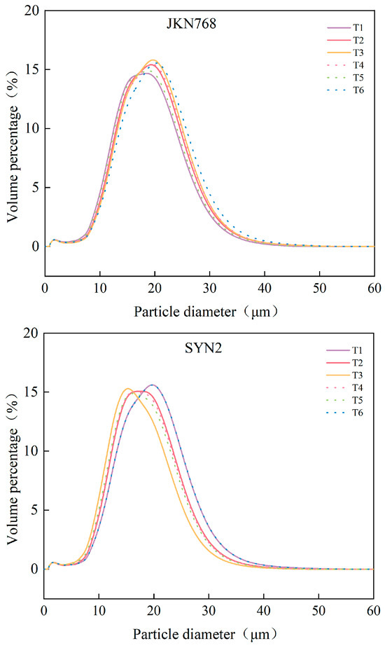 The effects of organic manure application on the volume and particle size of the starch are shown in Table 2. Compared to that under T2, the D(4, 3) value of starch in JKN768 increased by 1.70%, 3.97%, and 2.20% under T3–T5, respectively, and decreased by 0.92% under T6. On the contrary, the D(4, 3) value of starch in SYN2 decreased by 0.79%, 2.58%, 1.07%, and 3.08% under T3-T6, respectively. The starch granules were classified into three distinct categories, designated as “a,” “b,” and “c,” based on their diameter measurements (Figure 2). Replacing 40% of the nitrogen fertilizer with organic manure increased the average starch granule diameter in JKN768, but decreased it in SYN2. Notably, JKN768 contained a higher proportion of large granules (“a”), whereas SYN2 contained a greater proportion of medium-sized granules (“b”).