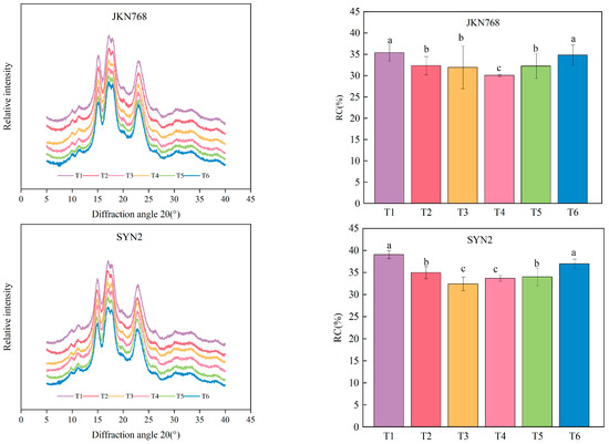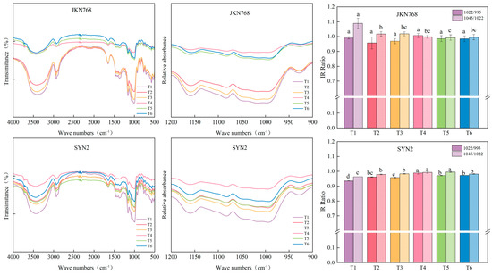 Organic manure and nitrogen fertilizers did not alter the type of starch crystals (Figure 3). The RC values for both varieties under T3–T5 decreased compared to those under T1 and T6 (Figure 3); this decline was consistent across both varieties. Relative to that under T2, the RC of the starch in JKN768 decreased by 1.27%, 7.12%, 9.73%, and 0.32% under T3–T5, respectively, while the RC of the starch in SYN2 decreased by 7.31%, 3.71%, 14.42%, and 2.85% under the same treatments. Similarly, the R1045/1022 ratio of the starch of JKN768 was higher than that of the starch in SYN2. The combined application of organic manure and nitrogen fertilizer did not alter the FTIR results for the starch (Figure 4). The combined application slightly decreased the R1045/1022 ratio of the starch in JKN768, but slightly increased that of the starch in SYN2 (Figure 4). It can be concluded that T3–T5 reduced the crystallinity of the starch and improved the orderliness of its structure.