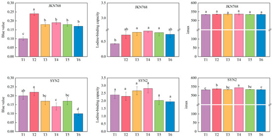 The λmax ranges for the two maize varieties were 534.57~537.23 nm and 532.30~544.30 nm, respectively (Figure 5). No notable differences were seen across the different fertilizer treatments. As the proportion of nitrogen fertilizer replaced with organic manure increased, the iodine-binding capacity of the starch in JKN768 initially increased and then declined, while that of the starch in SYN2 consistently decreased. The blue value of the starch significantly declined in both varieties, peaking under T2. As the proportion of nitrogen fertilizer replaced with organic manure rose, the swelling power and solubility of the starch in JKN768 increased (Figure 6). Relative to those under T2, the swelling power and solubility of the starch under T4 rose by 5.27% and 23.31%, respectively. In SYN2, these values initially rose, and then declined, with the swelling power increasing by 39.96% under T4.