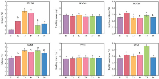The effects of organic manure and nitrogen fertilizer application on the solution, swelling power, and light transmittance of waxy maize starch. Mean values labeled with different letters are significantly different (p < 0.05).