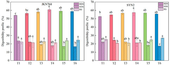 The effects of organic manure and nitrogen fertilizer application on the in vitro digestibility of waxy maize starch. Mean values labeled with different letters are significantly different (p < 0.05).Different colors represent different treatments, purple, red, orange, pink, green and blue represents T1, T2, T3, T4, T5 and T6 treatment, respectively. Under the same treatment, the left filling, middle slash and right grid patterns represents RDS, SDS and RS, respectively.