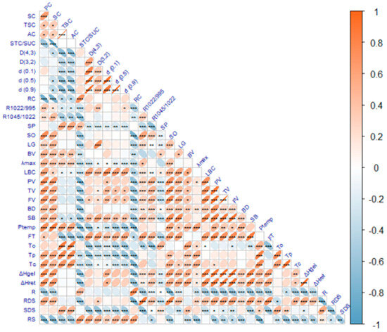 Pearson correlation analysis of the associations between the physicochemical properties and in vitro digestibility of the waxy maize starch. Positive and negative correlations are denoted in red and blue, respectively. The strength of the correlation is indicated by the width of the ellipsis and the color gradient; the bar indicates the coefficients and their related colors. PC: protein content; SC: sugar content; TSC: total starch content; AC: amylopectin content; STC/SUC: starch/sugar; AAC: apparent amylose content; d (0.1), d (0.5), and d (0.9) are the maximum sizes (μm) at 10%, 50%, and 90% of the total volume, respectively; D(3,2) is the surface-weighted mean diameter of starch particles; D(4,3) is the volume-weighted mean diameter of starch particles; RC: relative crystallinity; R1045/1022: the ratio of absorbance of 1047/1022 cm−1; R1022/995: the ratio of absorbance of 1022/995 cm−1; LG: light transmittance; SO: solubility; SP: swelling power; BV: blue value; λmax: maximum absorption wavelength; LBC: iodine-binding capacity; PV: peak viscosity; TV: trough viscosity; BV: breakdown viscosity; FV: final viscosity; SV: setback viscosity; Ptemp: pasting temperature; To: onset temperature; Tp: peak temperature; Tc: completion temperature; ΔHgel: phase transition enthalpy of original starch; ΔHret: phase transition enthalpy of regeneration starch; R: regeneration rate; RDS: rapidly digestible starch; SDS: slowly digestible starch; RS: resistant starch. *,** and *** represents significant at the 0.05, 0.01 and 0.001 probability level.