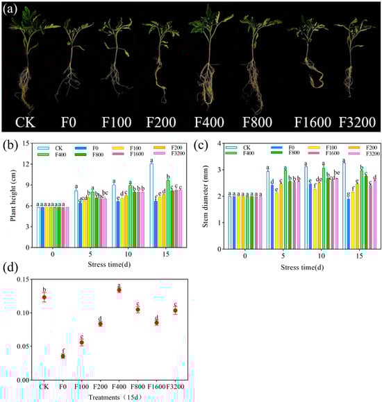 FA effects on ‘Provence’ tomato seedling morphology under drought stress. (a) Phenotype of tomato seedlings, (b) plant height, (c) stem diameter, (d) strong seedling index. Different lowercase letters (a–g) in the same column indicate significant differences between treatments for the same indicator (p < 0.05).
