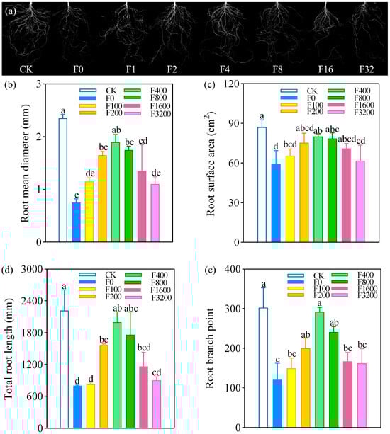 As can be seen from Figure 2, drought stress significantly reduced the mean root diameter, root surface area, total root length, and root branch points of tomato seedlings. Compared with the control, the mean root diameter, root surface area, total root length, and root branch points under F0 treatment were decreased by 32.25%, 68.09%, 64.04%, and 60.17%, respectively (p < 0.05). Compared with F0, the average root diameter, root surface area, total root length, and root branching points of F400 and F800 significantly increased by 35%, 153%, 151%, 143%, and 33%, 127%, 121% and 80%, respectively (p < 0.05). However, the mean root diameter, total root length, and root branch points in F400 did not decrease significantly compared with CK. In conclusion, FA can alleviate the damage to tomato seedling morphology and root system caused by drought stress.