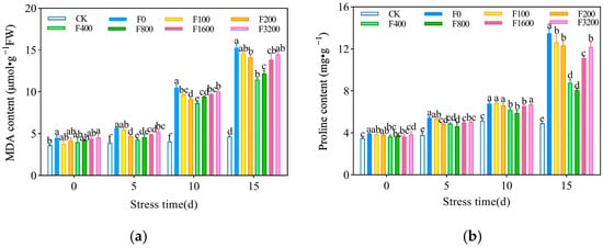 The contents of MDA and proline can be used as one of the key indices of plant stress resistance, and their contents increase significantly under stress conditions. As shown in Figure 3, MDA and proline contents increased significantly under drought stress, and showed a trend of continuous increase with the extension of drought time. MDA and proline contents under the F0 treatment increased significantly at 5~15 d, reaching 15.29 μmol·g−1FW and 13.48 mg·g−1 at 15 d. Compared with F0, MDA and proline contents decreased in different degrees during the whole drought stress period, and showed a trend of first decreasing and then increasing with the increase in concentration, and significantly decreased in the F400 and F800 treatments, respectively. At 5~15 d, the MDA content reached the minimum value with F400, which decreased by 24.38%, 17.73%, and 25.14% compared with the F0 treatment, respectively (p < 0.05). The proline reached the minimum value with F800, which decreased by 14.75%, 13.10%, and 40.27%, respectively, compared with the F0 treatment.