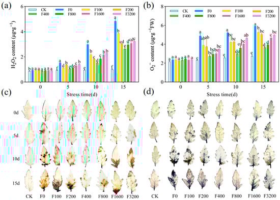 Drought stress triggers excessive accumulation of reactive oxygen species in plants, inducing cellular oxidative damage that impairs growth and development, potentially culminating in plant mortality. As shown in Figure 4a,b, the contents of H2O2 and O2− increased significantly due to drought stress and showed a gradually increasing trend with the extension of time, reaching the maximum value at 15 d. Compared with the control group, the F0 treatment significantly increased the levels of H2O2 and O2− by 383.10% and 115.87%, respectively (p < 0.05). After spraying FA, all treatments inhibited the production of H2O2 and O2−, which significantly decreased by 20.25~45.57% and 10.88%~38.04% compared with F0 (p < 0.05). However, during the whole drought stress period, the H2O2 and O2− contents were the lowest in the F400 treatment, which decreased by 41.52% and 41.50% on average compared with F0. It can also be seen, from the hydrogen peroxide (DAB) and superoxide anion (NBT) staining diagrams (Figure 4c,d), that drought stress significantly increases the accumulation of reactive oxygen species, and reactive oxygen species gradually increase with the extension of time. For instance, as drought stress is prolonged, the stained area of the leaves increases, and the color becomes darker. In contrast, the stained area of the leaves treated with FA decreases, and the intensity of staining diminishes.