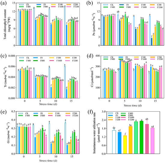 IWUE is a key factor in determining plant productivity, and F0 decreased by 7.57% compared with CK at day 15 of drought stress. After spraying FA, only F100 decreased significantly and was lower than F0, and other treatments were significantly higher than CK, among which F400 and F800 increased 36.97% and 39.85% compared with CK (p < 0.05) (Figure 5).
