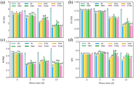 Under drought stress, compared with CK, the FV/FO, FV/FM, ΦPSⅡ, and QN of tomato seedling leaves decreased. On the fifth day, the FV/FO and FV/FM of each treatment had no significant change compared with F0, while ΦPSⅡ and QN of the F400 treatment were increased by 20.96% and 14.42% compared with F0 (p < 0.05). At 10–15 d, the fluorescence parameters of spray FA treatment were significantly improved compared with F0 and showed a concentration dependence. The F400 treatment was the best, and, at 15 d, the fluorescence parameters of spray FA treatment were increased by 46.24%, 49.98%, 42.47%, and 39.94%, respectively, compared with F0 (p < 0.05). The F800 treatment was also significantly increased compared with F0. There was no significant difference between F400 and F800 (Figure 6).