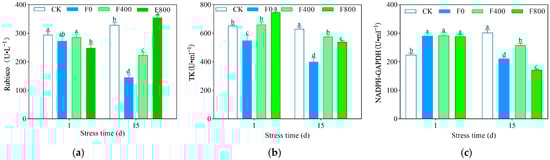 Rubisco is the most important enzyme in plant photosynthesis, and its activity directly affects the assimilation rate of CO2 and the net photosynthetic rate. TK plays a central role in the Calvin cycle, controlling photosynthetic carbon fixation and RuBP regeneration to a large extent. NADPH-GAPDH is a key enzyme in the Calvin cycle, and its activity directly affects the transport efficiency of photosynthetic carbon assimilation and plays an important role in the process of glucose metabolism and energy metabolism [,]. In this study, in the early stage of drought stress, the enzyme activities of Rubisco and TK in leaves of tomato seedlings began to decrease, but the decrease was small, while the enzyme activities of NADPH-GAPDH increased significantly (p < 0.05). With the extension of drought stress time, the enzyme activities of Rubisco, TK, and NADPH-GAPDH decreased significantly, and F0 decreased by 54.58%, 50.65%, and 29.06% compared with CK at the end of drought stress on 15 d. Under drought stress, although the enzyme activities of Rubisco, TK, and NADPH-GAPDH treated with FA decreased compared with CK, the NADPH-GAPDH enzyme activities of F800 were lower than those of F0 treatment, and the rest were higher than those of F0 treatment. Compared with F0, F400 and F800 improved by 89.16%, 98.48%, 142.20%, 13.47%, and 58.75%, respectively (p < 0.05).