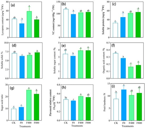 Effect of FA on tomato fruit quality under drought stress. (a) Lycopene content, (b) VC content, (c) soluble protein content, (d) soluble solids content, (e) soluble sugars content, (f) organic acid content, (g) sugar–acid ratio, (h) flavonoid content, (i) fruit firmness. Different lowercase letters (a–c) in the same column indicate significant differences between treatments for the same indicator (p < 0.05).
