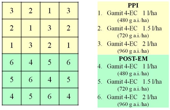 Schematic representation of the field trial design for clomazone degradation dynamics. There were two application types (PPI—pre-plant incorporated, POST-EM—post-emergence) and three application rates (480, 720 and 960 g a.i./ha) within each of these types.