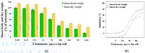 (a) Effect of clomazone on shoot fresh weight and shoot dry weight of white mustard. Data are expressed as percentage relative to control (±SE); (b) dose–response curves for the sensitivity of white mustard to clomazone. The regression lines were plotted using Equation (2) and the parameter values are shown in Table 3.