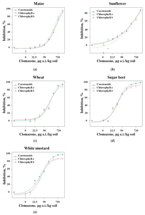 Dose–response curves for crop sensitivity to clomazone ((a) maize, (b) sunflower, (c) wheat, (d) sugar beet, (e) white mustard). The regression lines were plotted using Equation (2) and the parameter values are shown in Table 4.