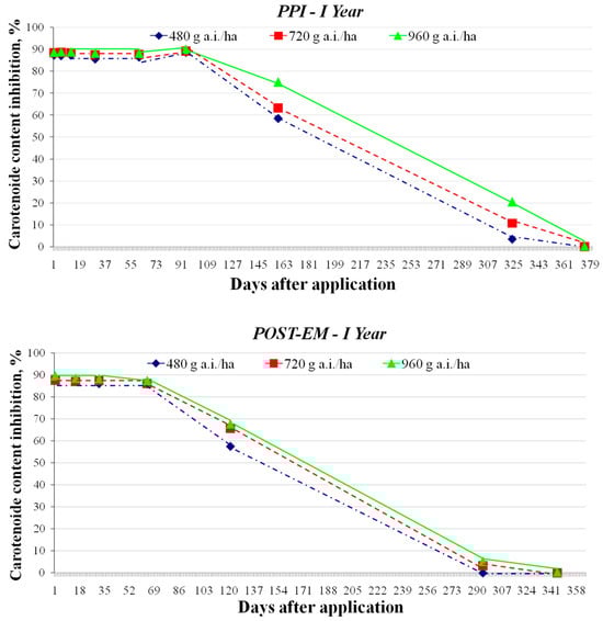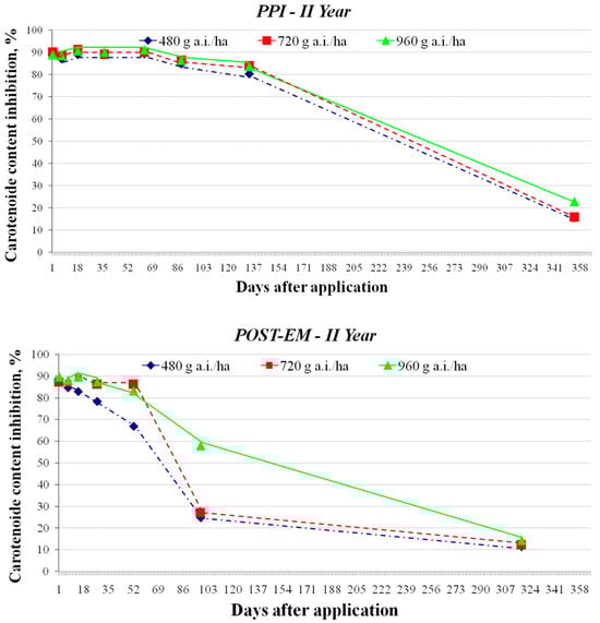 The dynamics of clomazone degradation were determined using the white mustard bioassay, which measured the decreasing inhibition of carotenoid content due to reduced clomazone residues in the soil (Figure 4 and Figure 5). The degradation of clomazone followed first-order kinetics in both experimental years and for all treatments (Figure 6 and Figure 7), which was confirmed by R2 values of 0.96 (p = 0.05) or higher for all PPI treatments and 0.67–0.96 (p = 0.05) for POST-EM treatments (Table 5).
