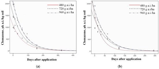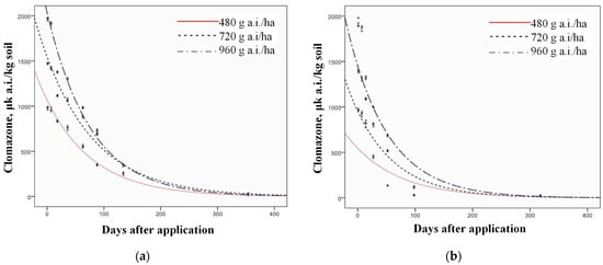 The dynamics of clomazone degradation shown in Figure 6 and Figure 7 followed a similar pattern for both application times and application rates. However, the half-lives differed, although not consistently. A comparison of DT50 values for different application rates showed no differences for the PPI treatments in the first year, while the differences for the POST-EM treatments were 16.6 days (due to a large deviation at the application rate of 480 g a.i./ha and with the highest value for the medium application rate). In the second year, the differences were 9.7 days for the PPI treatments (with the highest application rate having the shortest half-life and the medium application rate having the longest half-life) and 8.3 days for the POST-EM treatments (the lowest application rate had the longest half-life, while the other two application rates had the same DT50 values). This is consistent with the findings of other studies where the initial application rate of clomazone within the same time of application does not necessarily have a significant effect on the rate of degradation [32,42].