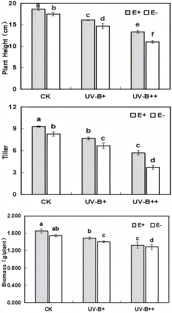 Effect of different UV-B radiation treatments on the plant height, tillers, and biomass of A. inebrians seedlings. Different lowercase letters in the figure indicate the variability of each indicator at the 0.05 level under different treatments (ANOVA).