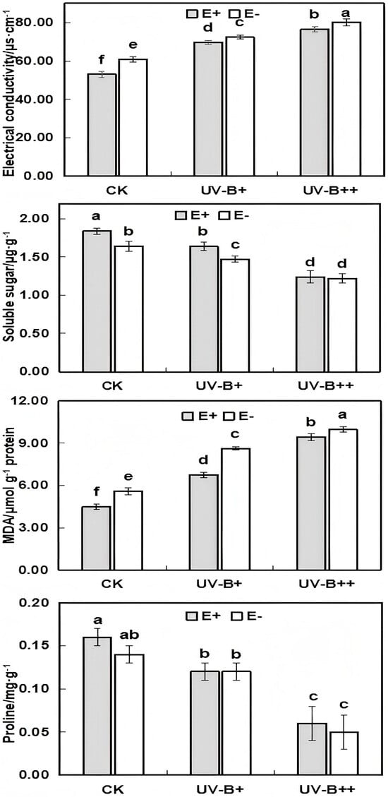 Effect of different UV-B radiation treatments on electrical conductivity, soluble sugar, malondialdehyde (MDA), and proline in A. inebrians seedlings. Different lowercase letters in the figure indicate the variability of each indicator at the 0.05 level under different treatments (ANOVA).