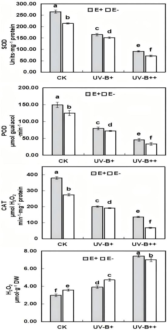 Effects of different UV-B radiation treatments on superoxide dismutase (SOD), polyphenol oxidase (POD), catalase (CAT), and hydrogen peroxide (H2O2) in A. inebrians seedlings. Different lowercase letters in the figure indicate the variability of each indicator at the 0.05 level under different treatments (ANOVA).