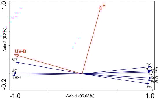 The result of RDA analysis among endophytic fungi treatment; UV-B treatment, plant growth, lipid peroxidation, and antioxidant capacity. Note: HO indicates H2O2; EC indicates electrical conductivity; TN indicates tiller number; BM indicates biomass; PH indicates plant height; SS indicates soluble sugar; Pro indicates proline; E indicates E. gansuensis treatment; UV-B indicates UV-B treatment.