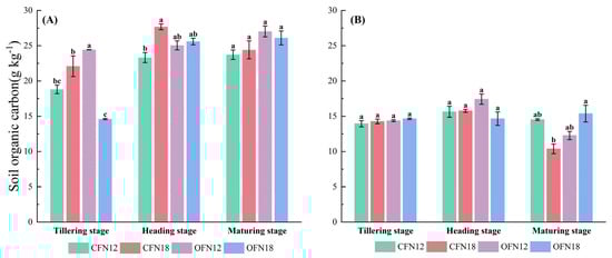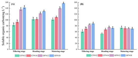Soluble organic carbon content under organic and conventional cultivation at two nitrogen levels. (A) 0–10 cm; (B) 10–20 cm. CFN12: conventional cultivation low nitrogen treatment, CFN18: conventional cultivation high nitrogen treatment, OFN12: organic cultivation low nitrogen treatment, OFN18: organic cultivation high nitrogen treatment. Different lowercase letters indicate significant differences among the four treatments at p < 0.05. The error bar represents the standard deviation of the mean.