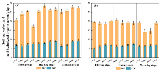 Soil total carbon and acid hydrolyzed organic carbon content under organic and conventional cultivation at two nitrogen levels. TOC, soil total carbon; AOC, soil acid hydrolysis organic carbon. (A) 0–10 cm; (B) 10–20 cm. Different lowercase letters indicate significant differences among the four treatments at p < 0.05. The error bar represents the standard deviation of the mean.