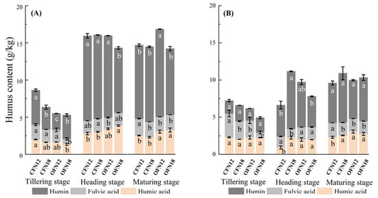 During the tillering stage, the proportion of humic and fulvic acids organic carbon content in soil humus is higher compared to other stages, ranging from 39.25% to 75.87% (Figure 4). After the tillering stage, organic carbon is mainly provided by humin, accounting for 52.93% to 71.65%, which is notably significant in the 0–10 cm soil layer. In the 0–10 cm soil layer during the heading and maturity stages, compared to OFN18, the carbon content of humin in OFN12 is significantly increased by 13.36% and 17.78%, respectively, with significant differences observed. The fulvic acid content shows relatively minor fluctuations overall. The humin content increased significantly during the heading and maturity stages. In contrast, the humic acid content showed a notable increase in surface soil following the tillering stage. During the heading stage, the carbon content of humin in all treatments increased by more than 35%, with the most significant increase observed in the OF treatment. Under conventional nitrogen application, the carbon content of humin acid in the OF treatment during the heading and maturity stages increased by 22.51% and 21.14%, respectively, compared to CF, and under the influence of N12, this increase was even higher, with significant differences observed. Additionally, in the surface soil after the tillering stage, compared to other treatments, OFN18 has a higher proportion of humic and fulvic acids, reaching 39.11% during the heading stage and 37.38% during the maturity stage, indicating a higher conversion rate of organic carbon to humic and fulvic acids in soil humus.