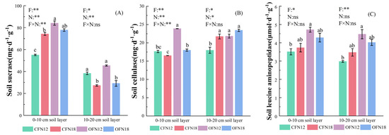 Concentrations of three enzymes under organic and conventional cultivation at two nitrogen levels. (A): Soil sucrase, (B): soil cellulase, (C): soil leucine aminopeptidase. F, cultivation pattern; N, nitrogen level; F × N, interaction between F and N. * indicate p < 0.05; ** indicate p < 0.01; ns indicate non-significance (p ≥ 0.05). Different lowercase letters indicate significant differences among the four treatments at p < 0.05. The error bar represents the standard deviation of the mean.
