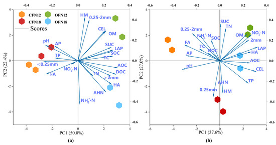 Principal component analysis of soil nutrients, enzyme activity, and active carbon and nitrogen in soil. (a) 0–10 cm; (b) 10–20 cm. Total nitrogen (TN), alkali-hydrolyzable nitrogen (AHN), ammonium nitrogen (NH4+-N), nitrate nitrogen (NO3−-N), total phosphorus (TP), available phosphorus (AP), soil organic matter (OM), pH, total carbon (TC), soil organic carbon (SOC), dissolved organic carbon (DOC), acid extractable organic carbon (AOC), sucrase (SUC), leucine aminopeptidase (LAP), and cellulase (CEL), fulvic acid (FA), humic acid (HA), humin (HM), proportion of different aggregate sizes (>2 mm, 0.25–2 mm, <0.25 mm).