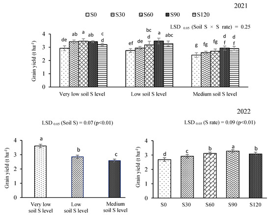 Grain yield varied significantly among the soil S levels with varying S application rates (Figure 1). In 2021, there was an interaction effect between soil S level and S application rate. Grain yield in the control treatments (0 kg S ha−1) was the lowest among all soil S levels, ranging from 2.4 to 2.8 t ha−1, but was increased by applying S fertilizer. The highest grain yield in response to S fertilizer in soil with very low S levels was 30–90 kg S ha−1, with an average grain yield of 3.4 t ha−1, and in soil with a low S level, it was 90–120 kg S ha−1, with a similar average grain yield of 3.4 t ha−1. The medium soil S level had a lesser response to S application. In 2022, there was no interaction effect between soil S level and S application rate, while grain yield varied significantly with soil S level and the rate of S application (Figure 1). The highest grain yields recorded in the very-low-, low-, and medium-S soils were 3.6, 2.9, and 2.6 t ha−1, respectively. The highest grain yield was 3.3 t ha−1 with S applied at 90 kg S ha−1, followed by 3.1 t ha−1 with 60 and 120 kg S ha−1, 2.9 t ha−1 with 30 kg S ha−1, and 2.7 t ha−1 for the control with no S application.