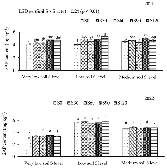 The 2AP content varied significantly among soil S levels with varying S application rates in 2021 and 2022 (Figure 2). In 2021, there was an interaction effect between different soil S levels and S application rates. The control with no S application in all soil S levels had the lowest grain 2AP content, ranging from 3.1 to 5.7 mg kg−1, and was slightly increased by S application. The highest 2AP content (5.3 mg kg−1) was obtained under the application of 120 kg S ha−1 in low-S soil, which was not different from the 90 kg S ha−1 (5.1 mg kg−1) in medium-S soil. In 2022, there was an interaction effect between soil S level and S application rate on the 2AP content (Figure 2). The highest 2AP content was recorded in low-S soil when applying 0, 30, and 120 kg S ha−1, with similar average grain 2AP contents of 5.8 mg kg−1, while 2AP slightly declined when S was applied at 60 and 90 kg S ha−1. Nevertheless, the grain 2AP content was still higher than under all applications of S in very-low- and medium-S soils, especially in very-low-S soil, which had a lower 2AP content than medium-S soil, but the level varied according to the rate of S application.