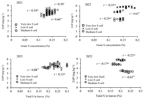On the other hand, in 2021, grain 2AP content was significantly correlated with grain S concentration in very low (r = 0.66 **) and low soil S levels (r = 0.50 *), but such a relationship was not found in medium-S soil (r = 0.34ns). In 2022, a relationship was observed between grain 2AP content and grain S concentration in soil with medium S level (r = 0.64 **), but not in soil with very low (r = 0.25ns) and low (r = −0.35ns) S levels (Figure 3). In contrast, grain 2AP content was correlated with leaf S concentration in very-low-S soil in both 2021 and 2022 (Figure 3).