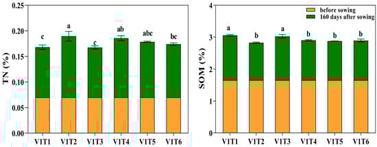 As shown in Figure 1, both conventional fertilization and the application of additional fertilizers and soil amendments could increase the soil TN content and decrease the SOM content. The overall trend was a decrease in SOM with an increase in TN. At 160 days after sowing, V1T2 had the highest TN content, which was 21.84% higher than that of V1T1, and the lowest SOM content, which was 16.48% lower than that of V1T1. At the same time point, V1T3 had relatively lower TN and higher SOM contents, with no significant differences compared with V1T1.