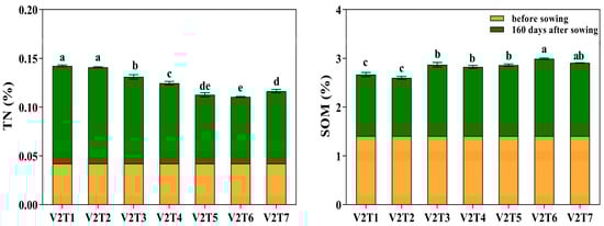 As illustrated in Figure 2, both the combined application of fertilizers and soil amendments and conventional fertilization increased the TN content while decreasing the SOM content, with an overall trend of decreasing SOM as TN increased. Among all treatments, V2T6 had the lowest TN content at 160 days after sowing, which was 31.93% lower than that of V2T1, and the lowest SOM content, which was 25.99% higher than that of V2T1. One hundred and sixty days after sowing, both the TN and SOM contents in V2T2 decreased compared with V2T1, but these reductions were not statistically significant.