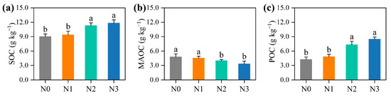 Effects of nitrogen (N) fertilisation on (a) soil organic carbon (SOC), (b) mineral-associated organic carbon (MAOC), and (c) particulate organic carbon (POC) contents. Different lower-case letters denote significant differences among different N fertilisation rates (p < 0.05). Values are mean ± standard errors (n = 6). N0, no N treatment; N1, low N treatment; N2: conventional N treatment; N3, high N treatment.
