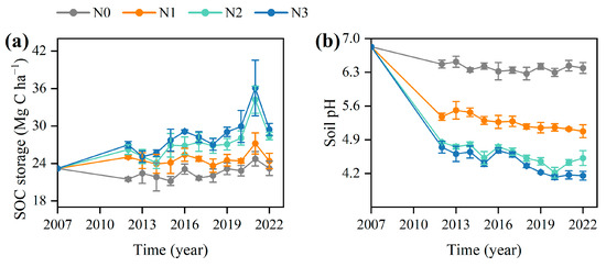 Dynamics of (a) soil pH and (b) soil organic carbon (SOC) storage under different nitrogen (N) fertilisation rates over ten years. Values are mean ± standard errors (n = 6). N0, no N treatment; N1, low N treatment; N2, conventional N treatment; N3, high N treatment.