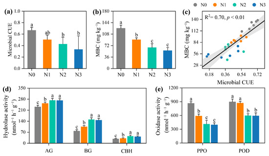 On average, N fertilisation significantly suppressed microbial CUE by 35.4% and microbial biomass C (MBC) content by 43.8%, relative to the N0 control (p < 0.05; Figure 3a,b). Further, linear regression analysis indicated that the MBC content increased with microbial CUE (p < 0.01; Figure 3c). Concomitantly, hydrolases activity (AG, BG, and CBH) increased significantly along the N addition gradient, whereas oxidases activity (POD and PPO) decreased (Figure 3d,e).