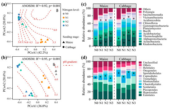 Effect of nitrogen (N) fertilisation on (a,c) bacterial and (b,d) fungal community composition and distribution. Principal coordinate analysis (PCoA) and similarity test (ANOSIM) based on the Bray–Curtis distances show (a) bacterial and (b) fungal communities under different N fertilisation rates. Relative abundance of major (c) bacterial (class) and (d) fungal (order) communities under different N fertilisation rates. Maize, maize-planted stage; Cabbage, cabbage-planted stage. Asterisks denote significant difference between fertilisations with and without N by LSD post hoc tests (p < 0.05). Values are mean ± standard errors (n = 6). N0, no N treatment; N1, low N treatment; N2, conventional N treatment; N3, high N treatment.