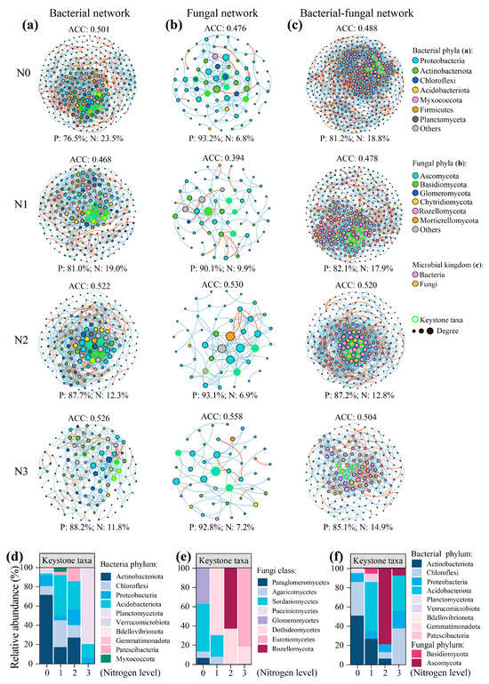 Effect of nitrogen (N) fertilisation on microbial co-occurrence patterns. (a) Bacterial, (b) fungal, and (c) Bacterial–fungal co-occurrence networks under different N fertilisation rates. The relative abundance of the keystone taxa in (d) bacterial, (e) fungal, and (f) Bacterial–fungal co-occurrence networks under different N fertilisation rates. The size of each node reflects the number of connections (degree), and the connection (edge) between two nodes reflects the value of Pearson and Spearman correlation scores (|r| > 0.8, p < 0.01). The blue edges indicate positive associations between two microbial nodes, while the red edges indicate negative associations. ACC, average clustering coefficients. N0, no N treatment; N1, low N treatment; N2, conventional N treatment; N3, high N treatment.