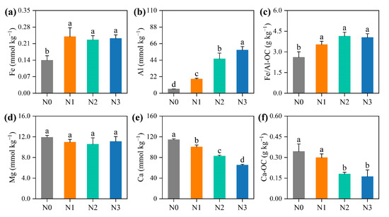 Effects of nitrogen (N) fertilisation on mineral protection of soil organic carbon. The contents of exchangeable (a) Fe, (b) Al, (d) Mg and (e) Ca, and (c) Fe/Al- and (f) Ca-bound organic carbon under different N fertilisation rates. Different lower-case letters denote significant differences among different N fertilisation rates (p < 0.05). Values are mean ± standard errors (n = 6). N0, no N treatment; N1, low N treatment; N2, conventional N treatment; N3, high N treatment.