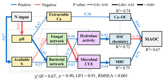 Effects of soil properties (pH, available N, extractable Ca and Ca-OC), microbial parameters (bacterial and fungal networks, hydrolase activity, microbial CUE, and MBC), and SOC chemistry (the ratio of 2930/1030) on MAOC content under N fertilisation, as estimated using the structural equation model (SEM). Blue and red arrows indicate positive and negative relationships, respectively, while grey arrows represent nonsignificant paths. Numbers adjacent to the arrows are standardised path coefficients, and path width indicates the strength of significant standardised path coefficients. Bacterial and fungal networks are represented by the first principal component (PC1) scores from principal component analysis. Ca-OC, calcium-bound organic C; MBC, microbial biomass carbon; MAOC, mineral-associated organic carbon; Microbial CUE, microbial carbon use efficiency; GFI, goodness-of-fit index; RMSEA, root mean square error of approximation.