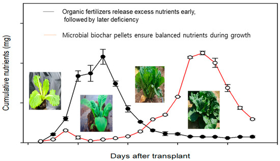 Animal waste is a valuable source of major plant nutrients, offering a sustainable alternative to chemical fertilizers [17]. However, excessive application of manure compost can lead to environmental issues, such as nutrient runoff from croplands. To address this, developing environmentally safe methods to mitigate non-point source pollution is essential. One promising approach is the development of microbial acidified biochar pellets as biofertilizers to enhance nutrient mineralization rates. Several studies have highlighted the synergistic effects of biochar blended with nutrient-rich manure in improving crop yields [18]. Healthy soil preserves microbial biodiversity, which regulates the plant pathogens and plant nutrients for plant growth, promoting positive symbiotic associations with plant roots and ultimately enhancing soil productivity [19]. Biochar is also considered a carrier for plant nutrients and microbial inoculants in soil due to its ability to slowly release nutrients and its massive porous structure for microbial activity [20,21,22]. In normal plant growth, soil nutrient supply should eventually correspond to the sigmoid pattern of nutrient uptake over growing periods. Therefore, the acidified biochar pellets inoculated with microorganisms should facilitate the slow release of nutrients for crop growth, as illustrated in Figure 1.