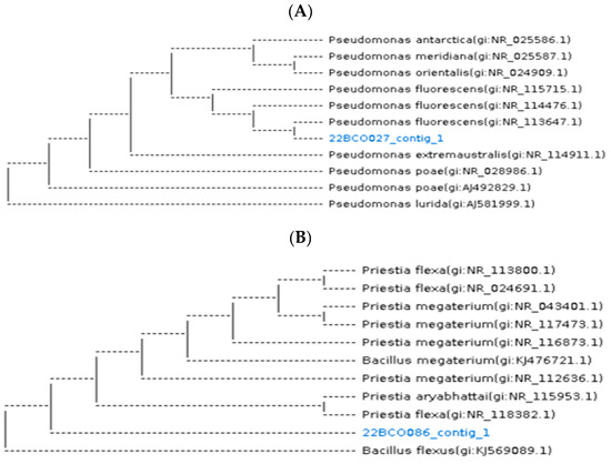 Identification of Pseudomonas fluorescens 22BCO027 (A) and Bacillus megaterium 22BCO086 (B). The sequence 22BCO027_contig_1 corresponded to Pseudomonas fluorescens 22BCO027, while 22BCO086_contig_1 corresponded to Bacillus megaterium 22BCO086.
