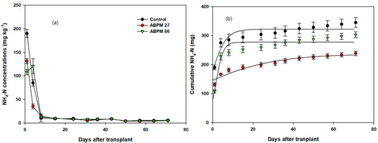 Ammonium nitrogen (NH4-N) is mineralized from organic resources under oxidation conditions and serves as an essential macronutrient for plant growth. The changes in NH4-N concentrations (a) and cumulative NH4-N (b) in plots treated with ABPM 27 and ABPM 86 during cabbage cultivation for Kimchi production are shown in Figure 4. In the control, NH4-N concentration dropped sharply from 85.2 mg kg−1 to 10.2 mg kg−1 within four days post-transplanting. For all treatments, NH4-N concentrations gradually decreased after day 15 until harvest. However, cumulative NH4-N increased rapidly until day 15 and continued to rise more gradually throughout the growing period.