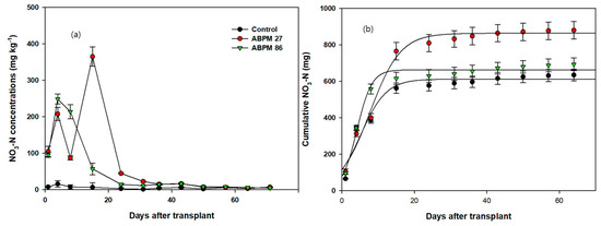 Changes in NO3-N concentrations (a) and cumulative NO3-N (b) fitted with a sigmoid equation in soils treated with ABPM inoculated with P. fluorescens 22BCO027 and B. megaterium 22BCO086 during the cultivation period. Error bars display standard deviation.