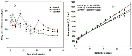 Changes in P2O5 concentrations (a) and cumulative P2O5 described with the linear equations (b) in soils treated with ABPMs inoculated with P. fluorescens 22BCO027 and B. megaterium 22BCO086 during cultivation. Error bars display standard deviation.